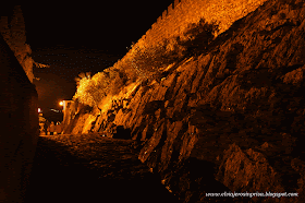 Continuamos nuestro paseo nocturno a lo largo de la gran muralla que domina con sus almenas el perfil de la ciudad. Los escasos focos que la iluminan hacen que nuestro paseo adquiera un cierto gustillo de trasiego medieval. Desde lo alto y por la noche todo es mucho mas mágico.
